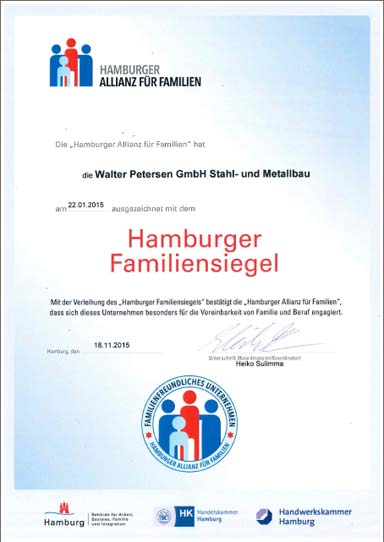 2015 Die Hamburger Allianz für Familien bescheinigt der Walter Petersen GmbH eine besondere